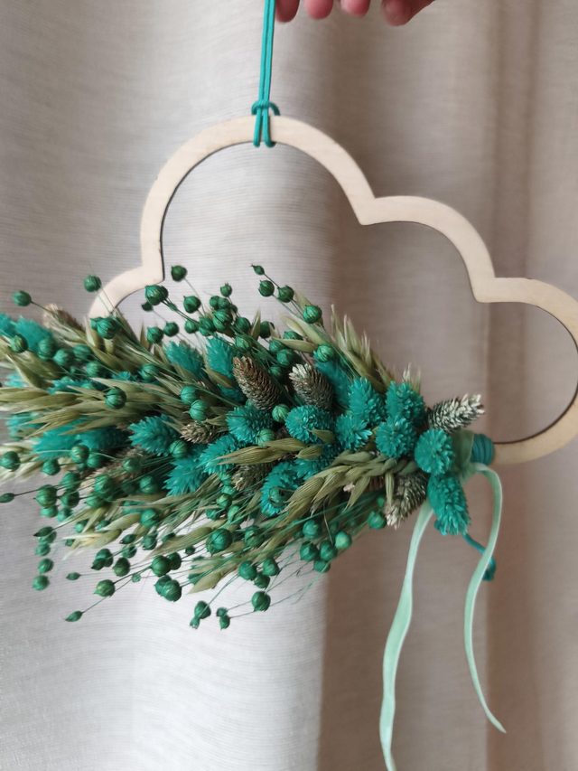 20 cm magas, 30 cm hosszú szárazvirágos felhő formájú falidísz/ajtódísz.